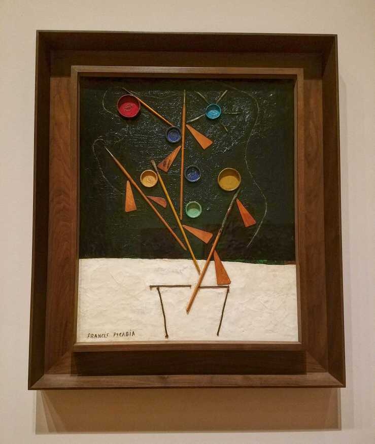 Painting (Flowerpot) (Peinture [Pot de fleurs]) c. 1924-25. Enamel paint, Ripolin paint-can lids, brushes, wooden stretcher wedges, string and quill toothpicks on canvasWoman with Monocle (La Femme au monocle). Alternative title: Woman with Pink Gloves (Man with Gloves) (La Femme aux gants roses [L’Homme aux gants]) c. 1925-26. Oil and enamel paint on boardFrom the accompanying tag: ”In 1926, the review ‘This Quarter’ reproduced thirteen of Picabia’s ‘Monster’ paintings, including this one, which bore the title ‘Woman with Pink Gloves’. By the time of the painting’s first known exhibition in 1956 however, it had acquired the title ‘Man with Gloves’. The work is displayed here with both titles restored. Although neither necessarily originated with Picabia, both speak to the androgynous character of his wasp-waisted, white-suited figure. With its green face, single oversized eye, and pustule-pink hands presumably clad in driving gloves, it is one of Picabia’s quintessential Côte d’Azur Monsters. The Surrealist André Breton was one of its early owners.”
