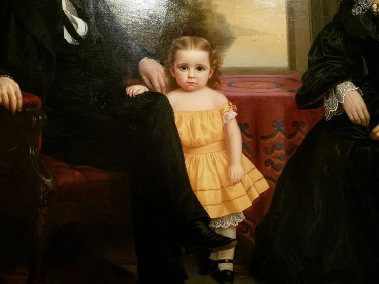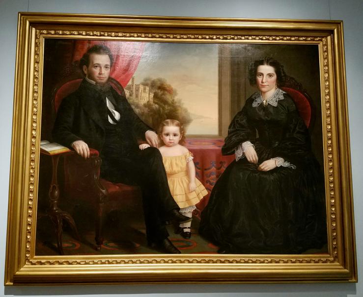{”This painting of an unidentified family bears the hallmarks of high-style portraits produced in New York during the antebellum era: saturated colours; attentiveness to details of costume, coiffure and jewellery; accurate facial depictions. The setting is a richly appointed Rococo Revival parlour. Seen through the window is a castellated Gothic Revival villa, possibly the family’s home, perched on a cliff overlooking the Hudson River. While it is similar to many designed by architects such as Alexander Jackson Davis during the period, it may be the home they aspired to, rather than their actual house. Details suggest that the child is deceased: the woman wears a cameo brooch carved with Orheus holding his lyre, a reference to the myth of Orpheus’ attempt to rescue his beloved Eurydice from the underworld; the possibly phantom house (a castle in the sky?); and the adults are wearing sombre black clothing.”}