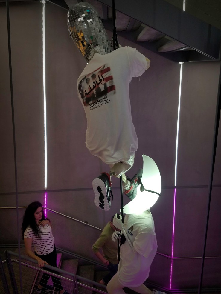 Plaster, sulfur, goldstone, steel, epoxy resin, polyurethane resin, custom clothing, screen printed T-shirt, sneakers, spray paint, LEDS and duct tape, dimensions variable.