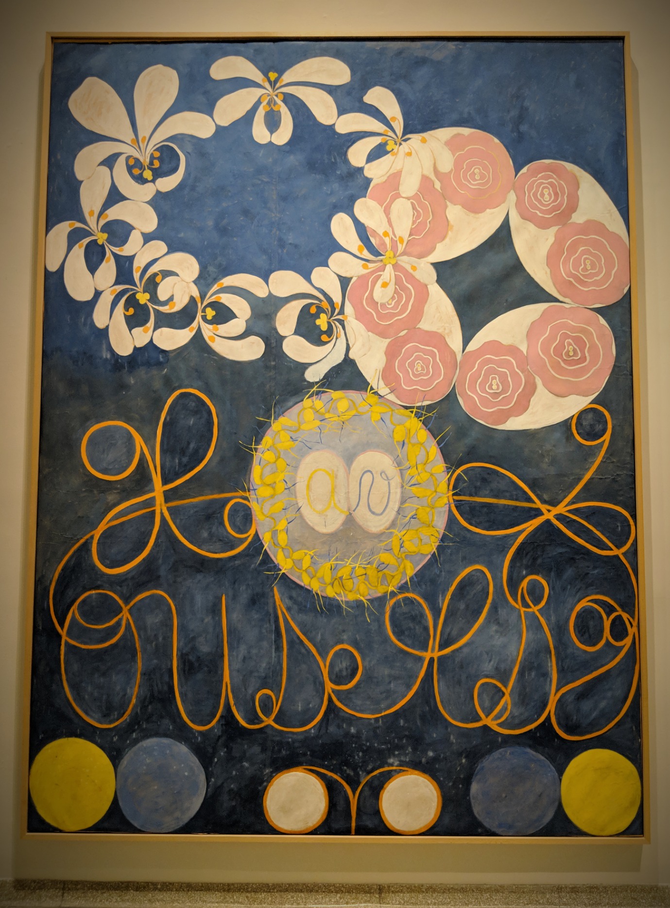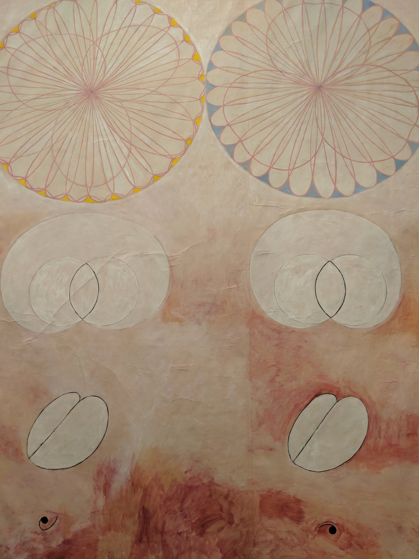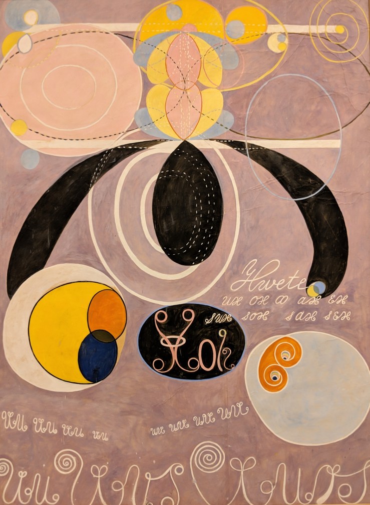 When Hilma af Klint began creating radically abstract paintings in 1906, they were like little that had been seen before: bold, colorful, and untethered from any recognizable references to the physical world. It was years before Vasily Kandinsky, Kazimir Malevich, Piet Mondrian, and others would take similar strides to rid their own artwork of representational content. Yet while many of her better-known contemporaries published manifestos and exhibited widely, af Klint kept her groundbreaking paintings largely private. She rarely exhibited them and, convinced the world was not yet ready to understand her work, stipulated that it not be shown for twenty years following her death. Ultimately, her work was all but unseen until 1986, and only over the subsequent three decades have her paintings and works on paper begun to receive serious attention. [source: The Guggenheim]