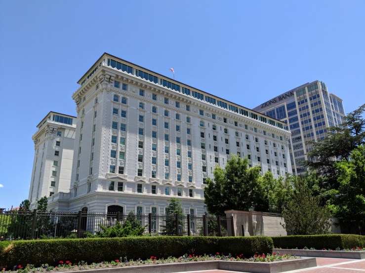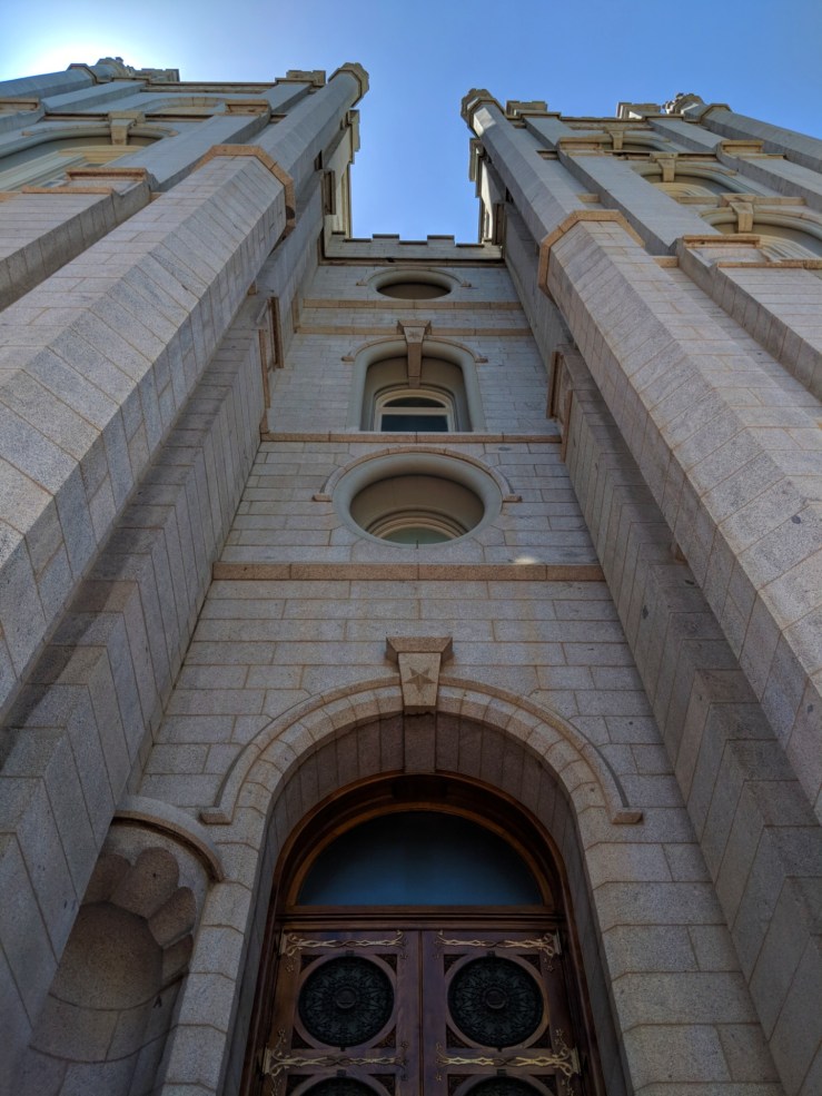 But, first, a view of the exterior of the grand Joseph Smith Memorial Building, the interior of which we explored yesterday, then the simple vertical lines of The Church of Jesus Christ of Latter-day Saints – Church Office Building, its minimal design in contrast to its convoluted name; and, finally, the most sacred of them all, the Salt Lake Temple; a place of worship and, as such, open only to members of the Church of Jesus Christ of Latter-day Saints, and certainly not to tourists. For the curious, there’s always the South Visitors’ Center, where a scale model of the temple and its interior is available for all to see. That’s where we’re going tomorrow. But, for now, please enjoy the views from the Temple grounds.