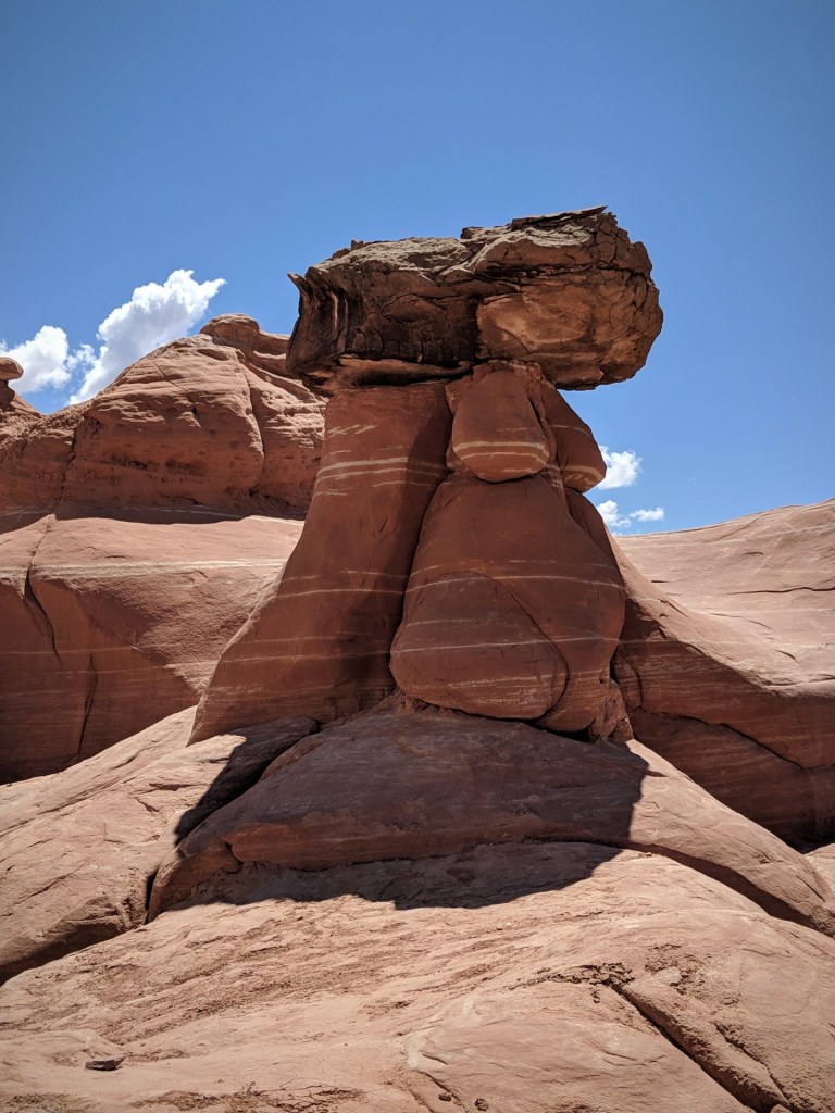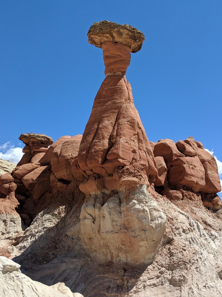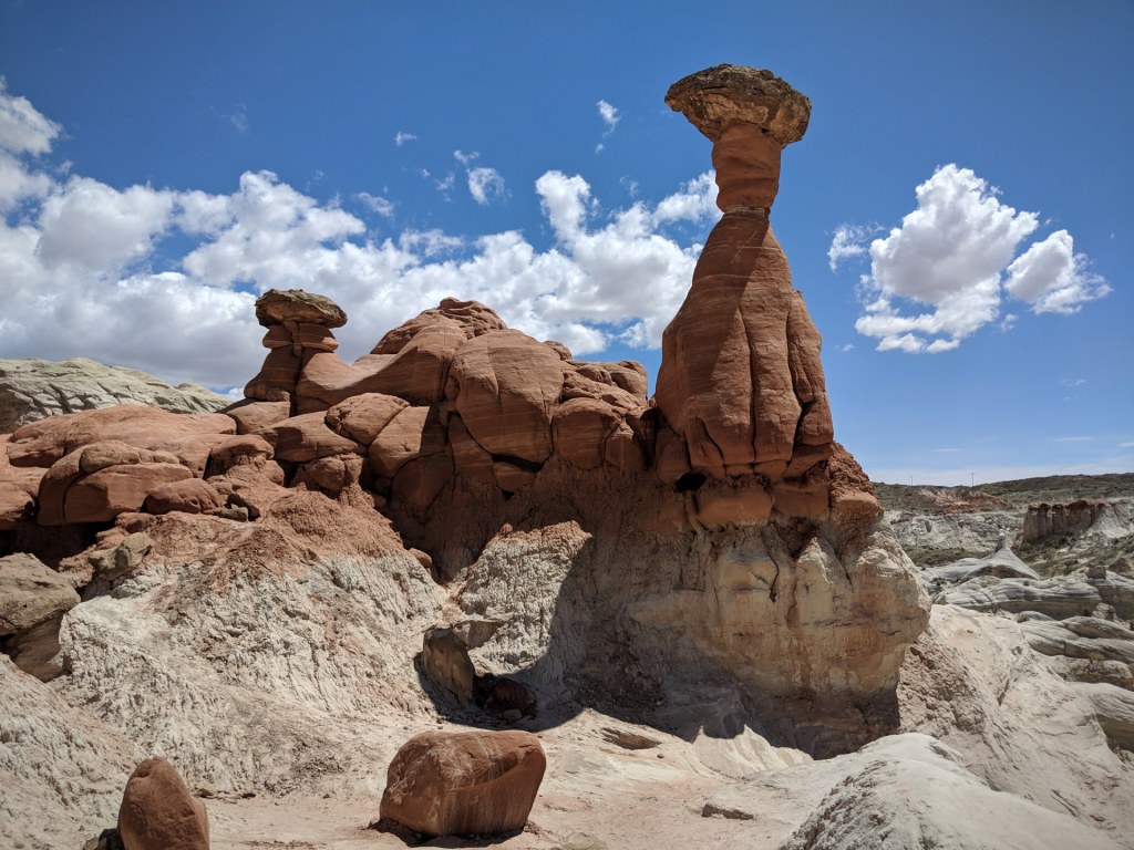 The Toadstool Hoodoos are part of the Grand Staircase-Escalante National Monument, Utah. Located between Kanab and Big Water, they are easily accessible via a trail off US 89, between mile marker 19 and 20. The hike is around 1.6 miles out-and-back with absolutely no shade.