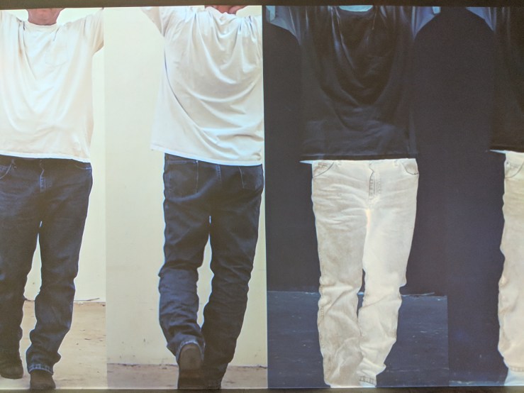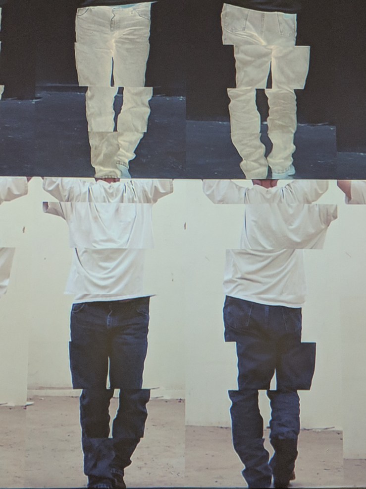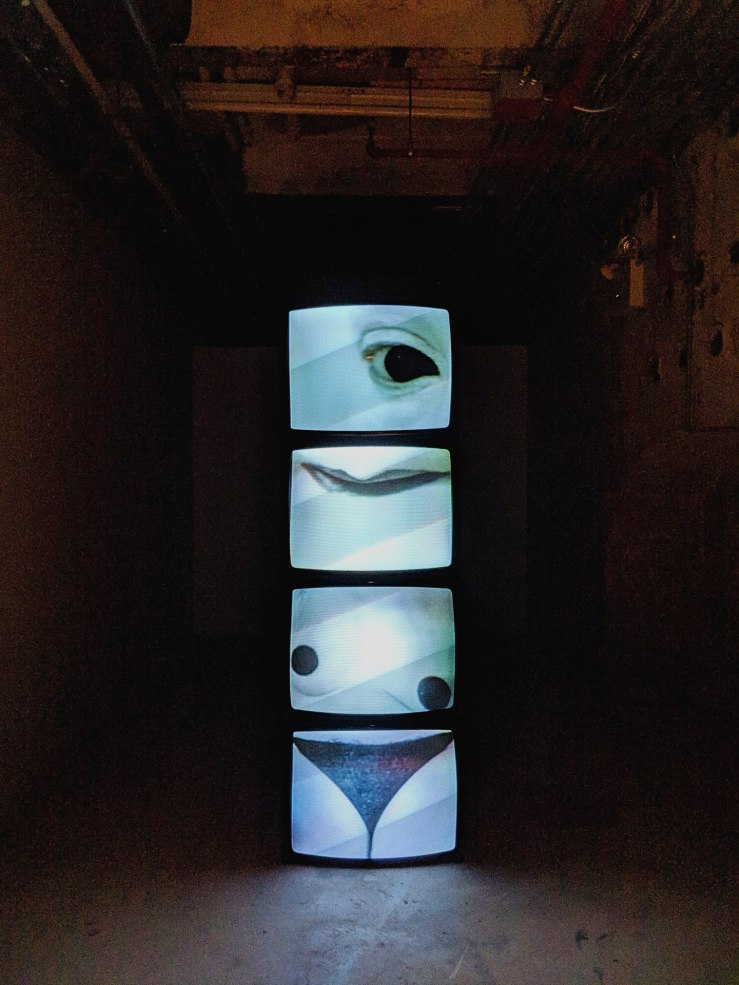 ”The New Embodied Sign Language” comprises four monitors displaying close-up videos of the artist’s body altered by theatrical makeup. The videos (subtitled Augenwerk [Eye Work], Mundwerk [Mouth Work], Bruststück [Breast Piece], and Schamwerk [Pubic Work]) are shown on monitors stacked on top of each other to reach roughly the height of a human body.