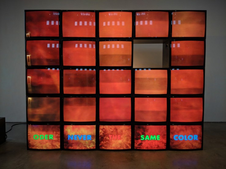 Maria Vedder’s ”PAL oder Never The Same Color”, a video installation with twenty-five monitors, was first presented in 1988. PAL (Phase Alternating Line) is the system used to standardize color broadcasting in Europe, developed for analog television. NTSC (National Television System Committee), mockingly dubbed “Never The Same Color,” is the competing standard in North America.