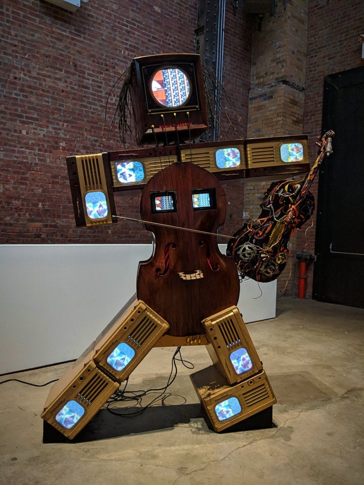 Nam June Paik, ”Charlotte Moorman II”, 1995. Nine antique TV cabinets, two cellos, one 13-inch color TV, two 5-inch color TVs, eight 9-inch color TVs, and two- channel video.