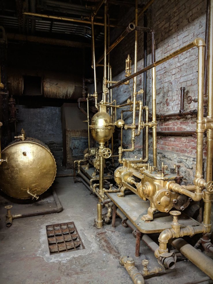 Saul Melman took it upon himself to bring a previously unnoticed element of the building back into the spotlight, by sandblasting the boiler and spending days scrubbing and cleaning the floors and surrounding area. Finally, he applied gold leaf leaving small sections of the pipes uncovered, showing their original beauty.