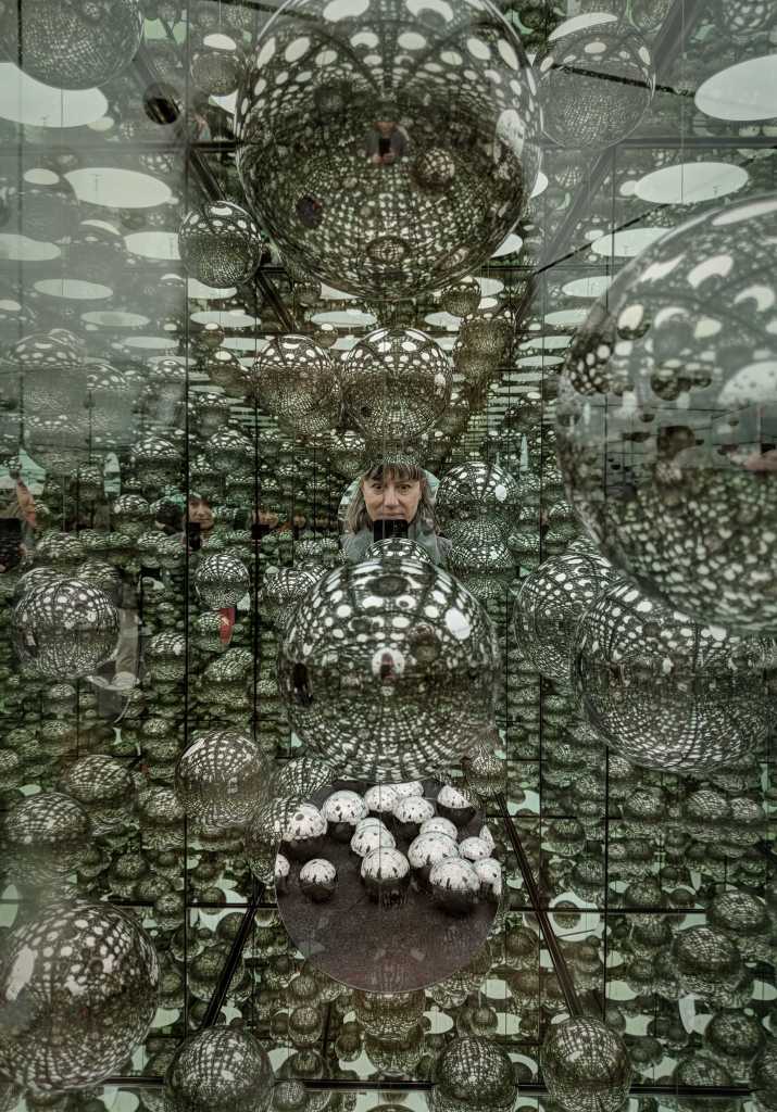 The exhibition in Chelsea featured two new Infinity Mirror Rooms, one which could be seen through a peephole (below) and another, where the viewers could walk in (from which yesterday’s ”teaser” photos). There was also a red and white polka-dotted space and a larger one featuring sixty-six paintings from the artist’s iconic My Eternal Soul series and three large-scale flower sculptures.
