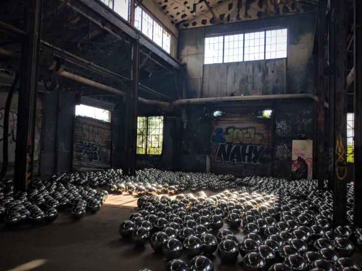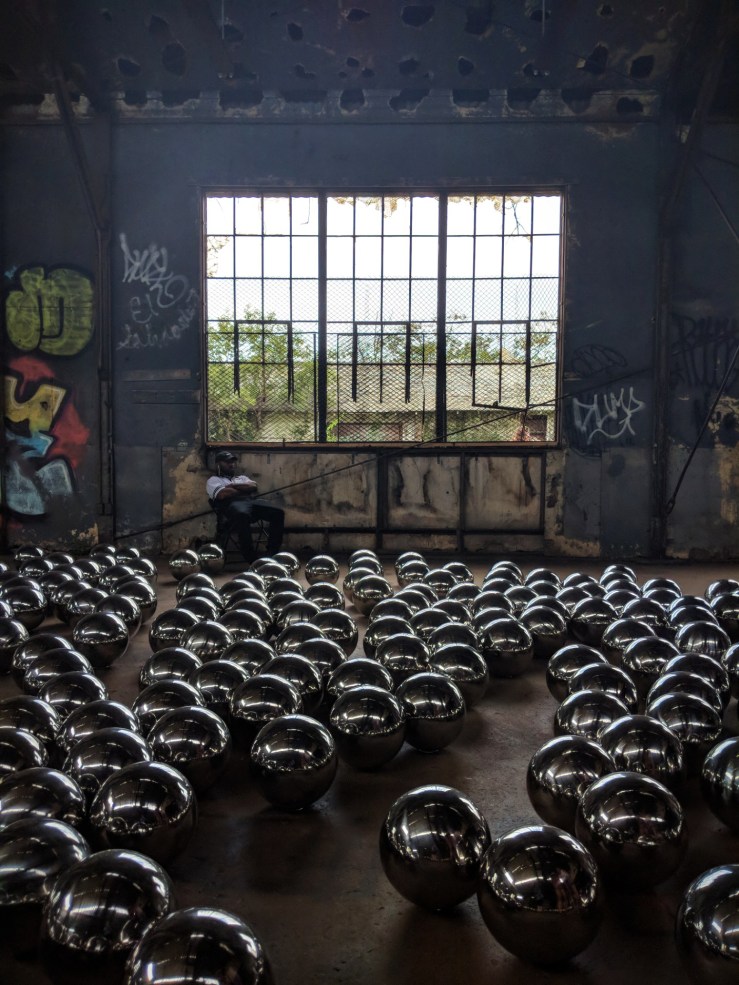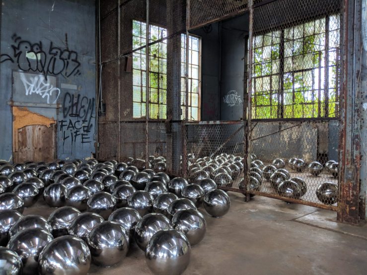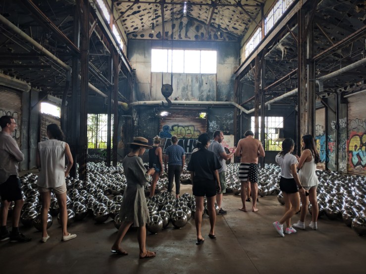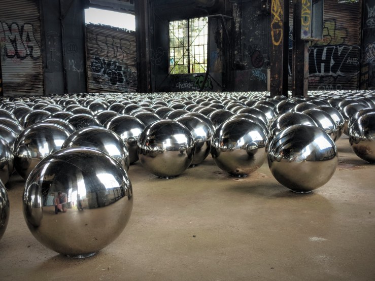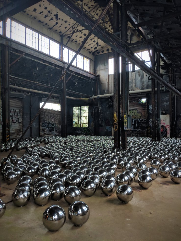 ”Comprised of 1,500 mirrored stainless steel spheres, Narcissus Garden landed in a former train garage that dates to the time when Fort Tilden was an active US military base. The mirrored metal surfaces reflect the industrial surroundings of the now-abandoned building, drawing attention to Fort Tilden’s history as well as the devastating damage inflicted on many buildings in the area by Hurricane Sandy in 2012.