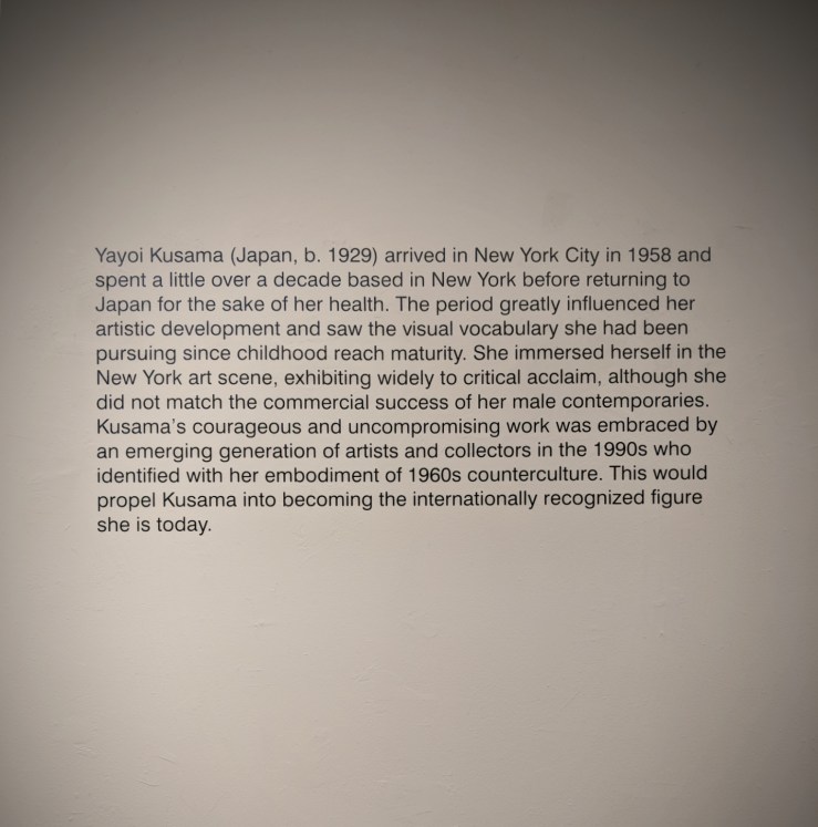 Festival of Life ran through a limited time only, in David Zwirner Chelsea concurrently with an exhibition of Kusama’s new Infinity Nets paintings, in their uptown location. We never made it to the latter.