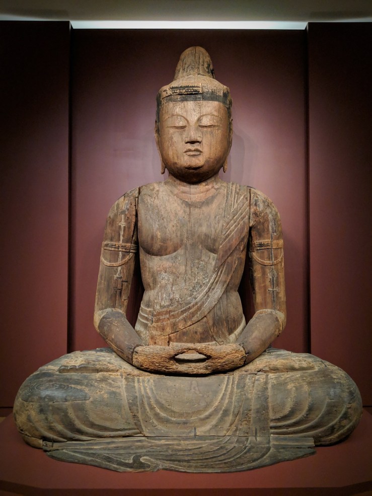 This sculpture was originally the main figure of worship in a temple, surrounded by other Buddhas, bodhisattvas, and guardian figures. Visitors would have come to pray or attend rituals and sutra readings performed by monks. The RISD Museum acquired the statue in the 1930s. Records state it was the principal image of Rokuon-ji, a Shingon sub-temple in Hyogo Prefecture, along Japan’s Inland Sea. Legend has it that the temple was destroyed by fire hundreds of years ago but that the statue was stored in a nearby farmhouse until 1933, when it was brought to the U.S. by the Japanese art dealer Yamanaka. The largest wooden Japanese sculpture in the United States, it was constructed from 11 hollowed and carved pieces of wood. Its simple surfaces and serene expression are representative of the late Heian Period.